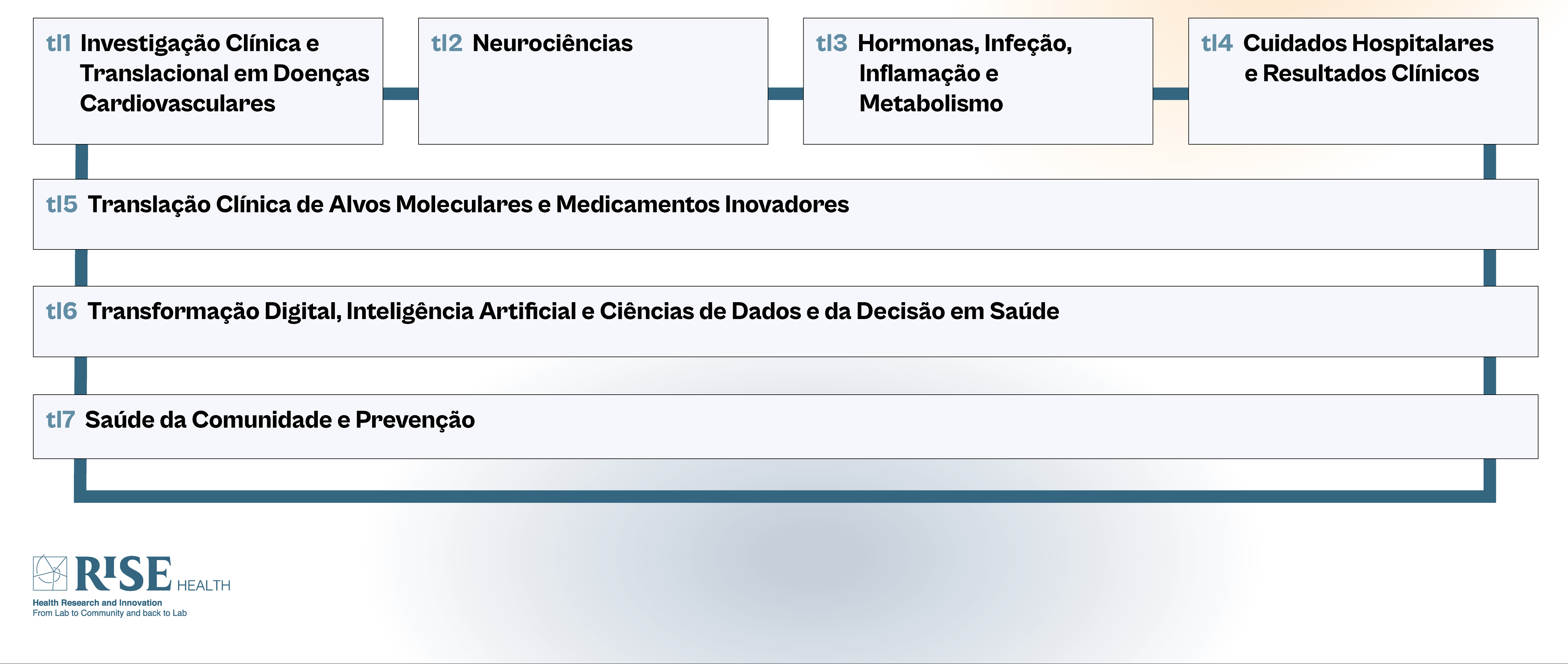 O RISE-Health está organizado em 7 linhas temáticas, 4 verticais e 3 horizontais, dentro de campos específicos da medicina, refletindo metodologias de investigação translacional e cobrindo vários tópicos de investigação médica. A linhas horizontais intersetam as linhas verticais, criando “hotspots” para a inovação que conduz ao conhecimento e à transferência de tecnologia, parcerias industriais e colaboração com redes internacionais.